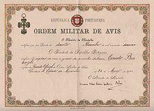 The Military Order of Aviz (Portuguese: Ordem Militar de Avis, pronounced [ɐˈviʃ]), previously to 1910 Royal Military Order of Aviz (Portuguese: Ordem Real Militar de Avis), previously to 1789 Knights (of the Order) of Saint Benedict of Aviz (Portuguese: Ordem de São Bento de Aviz) or Friars of Santa Maria of Évora, is a Portuguese order of chivalry, founded in Portugal in 1146. It gave its name and coat of arms to the Aviz Dynasty that ruled Portugal between 1385 and 1580.