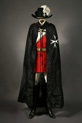 The cloak of the Order is plain black with a large, white, linen eight-pointed cross on the left breast. For most knights, the cloak is black woollen (to which French knights add distinctive white woollen collars) with a plain lining, but the Herrenmeister’s cloak is of black velvet lined in satin. The cloaks of most knights are closed only at the neck, but the Herrenmeister, Commanders, Honorary Commanders, and Knights of Justice also wear a long black cord called a cingulum.[24]