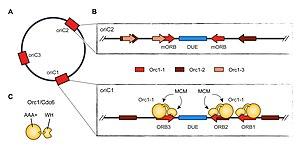- ^ Rowley A, Cocker JH, Harwood J, Diffley JF (June 1995). "Initiation complex assembly at budding yeast replication origins begins with the recognition of a bipartite sequence by limiting amounts of the initiator, ORC". The EMBO Journal. 14 (11): 2631–41. doi:10.1002/j.1460-2075.1995.tb07261.x. PMC 398377. PMID 7781615.