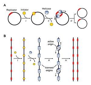 The origin of replication (also called the replication origin) is a particular sequence in a genome at which replication is initiated.[1] Propagation of the genetic material between generations requires timely and accurate duplication of DNA by semiconservative replication prior to cell division to ensure each daughter cell receives the full complement of chromosomes.[2] This can either involve the replication of DNA in living organisms such as prokaryotes and eukaryotes, or that of DNA or RNA in viruses, such as double-stranded RNA viruses.[3] Synthesis of daughter strands starts at discrete sites, termed replication origins, and proceeds in a bidirectional manner until all genomic DNA is replicated. Despite the fundamental nature of these events, organisms have evolved surprisingly divergent strategies that control replication onset.[2] Although the specific replication origin organization structure and recognition varies from species to species, some common characteristics are shared.