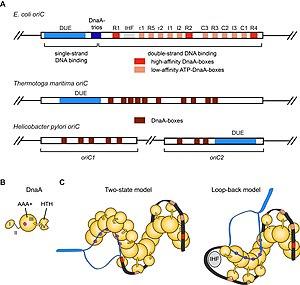 Most bacterial chromosomes are circular and contain a single origin of chromosomal replication (oriC). Bacterial oriC regions are surprisingly diverse in size (ranging from 250 bp to 2 kbp), sequence, and organization;[45][46] nonetheless, their ability to drive replication onset typically depends on sequence-specific readout of consensus DNA elements by the bacterial initiator, a protein called DnaA.[47][48][49][50] Origins in bacteria are either continuous or bipartite and contain three functional elements that control origin activity: conserved DNA repeats that are specifically recognized by DnaA (called DnaA-boxes), an AT-rich DNA unwinding element (DUE), and binding sites for proteins that help regulate replication initiation.[17][51][52] Interactions of DnaA both with the double-stranded (ds) DnaA-box regions and with single-stranded (ss) DNA in the DUE are important for origin activation and are mediated by different domains in the initiator protein: a Helix-turn-helix (HTH) DNA binding element and an ATPase associated with various cellular activities (AAA+) domain, respectively.[53][54][55][56][57][58][59] While the sequence, number, and arrangement of origin-associated DnaA-boxes vary throughout the bacterial kingdom, their specific positioning and spacing in a given species are critical for oriC function and for productive initiation complex formation.[2][45][46][60][61][62][63][64]
