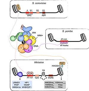 - ^ Lipford JR, Bell SP (January 2001). "Nucleosomes positioned by ORC facilitate the initiation of DNA replication". Molecular Cell. 7 (1): 21–30. doi:10.1016/s1097-2765(01)00151-4. PMID 11172708.