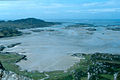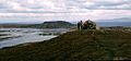 The island rises to a height of 93 m (305 ft) at Beinn Orasaigh and is linked to Colonsay by a tidal causeway (called An Traigh (The Strand)) consisting of sands and mud flats. In the 2001 census Oronsay was recorded as having a population of five people, who lived at the farm adjacent to Oronsay Priory. In 2011 the population had risen to eight.[5] The island has no facilities for visitors and is now privately owned, with the RSPB farming the island for the American owner. It is dependent upon tidal access to and from Colonsay. There is a small grass air strip south of the priory that "fights a losing battle with the rabbits".[3]