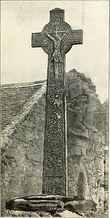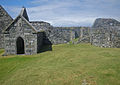 Oronsay also had a medieval Augustinian priory, the ruins of which are still extant.[20] It was built c. 1380, possibly on the site of an earlier church (for whose existence there is actually no surviving evidence), perhaps founded by John of Islay, Lord of the Isles.[21] By the early 16th century a distinct 'school' of monumental sculpture flourished on Oronsay.[22] Two substantial celtic crosses sit outside the perimeter of the buildings[3] and many slabs with effigies or other carvings are still to be found within the priory itself.[23]