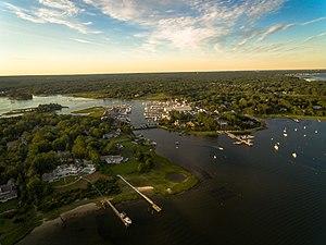 A steel drawbridge connects the village to Little Island and Grand Island (also known as Oyster Harbors), a gated community featuring many luxury houses and a private country club. The neighborhood of Wianno abuts the East Bay section of Osterville.