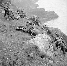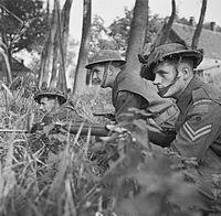After Dunkirk the 1st Ox and Bucks was brought up to strength with large numbers of conscripts and later transferred to the 148th Independent Brigade Group serving in Northern Ireland. In 1941 the 1st Ox and Bucks commemorated the bicentenary of the 43rd Light Infantry which included a celebratory parade and evening concert.[62] In June 1942, however, the battalion was again transferred, this time to the 71st Infantry Brigade, serving alongside the 1st Battalion, East Lancashire Regiment and 1st Battalion, Highland Light Infantry, part of the 42nd Armoured Division. In October 1943 the brigade became part of the 53rd (Welsh) Infantry Division and started training for the invasion of North-Western Europe. The battalion would remain with the 53rd Division for the rest of the war. The 1st Ox and Bucks landed in Normandy on 24 June 1944[63] with the rest of the 53rd (Welsh) Division. On 25 June Operation Epsom began what was intended to take the town of Caen — a vital objective for the British and Canadians that proved to be a formidable town to capture – it was unsuccessful. However, it did divert significant numbers of Germans away from the American troops. The Germans counter-attacked, the 1st Ox and Bucks moved to positions around the Odon bridgehead where it suffered from heavy German artillery fire. The Allies launched further attempts to capture Caen, the first Allied troops entered the city during Operation Charnwood on 9 July; by then, much of it had been destroyed. After holding the line the 1st Battalion's first major engagement with the enemy during the battle for Caen was the successful attack to capture the village of Cahier and a nearby mill. Fighting around Caen continued for much of the month, with the battalion sustaining significant casualties. The battalion later fought in the Second Battle of the Odon. In August it took part in an advance towards Falaise, known as Operation Totalize. The Allies reached and captured it. The battalion also captured Pierrefitte during the operation to close the Falaise pocket, encircling two German field armies, the Fifth and 7th, the latter of which was effectively destroyed by the Allies. The victory at Falaise signified the end of the Battle for Normandy. The 1st Battalion, Ox and Bucks then took part in the advance east, eventually entering Belgium in early September.[64]