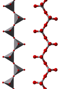 A polyoxyanion is a polymeric oxyanion in which multiple oxyanion monomers, usually regarded as MOn polyhedra, are joined by sharing corners or edges.[4] When two corners of a polyhedron are shared the resulting structure may be a chain or a ring. Short chains occur, for example, in polyphosphates. Inosilicates, such as pyroxenes, have a long chain of SiO4 tetrahedra each sharing two corners. The same structure occurs in so-called meta-vanadates, such as ammonium metavanadate, NH4VO3.