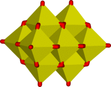 7 even contain both tetrahedral and octahedral units.[5][6] Edge-sharing is common in ions containing octahedral building blocks and the octahedra are usually distorted to reduce the strain at the bridging oxygen atoms. This results in 3-dimensional structures called polyoxometalates. Typical examples occur in the Keggin structure of the phosphomolybdate ion. Edge sharing is an effective means of reducing electrical charge density, as can be seen with the hypothetical condensation reaction involving two octahedra: