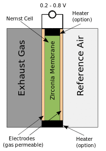 The zirconium dioxide, or zirconia, lambda sensor is based on a solid-state electrochemical fuel cell called the Nernst cell. Its two electrodes provide an output voltage corresponding to the quantity of oxygen in the exhaust relative to that in the atmosphere.