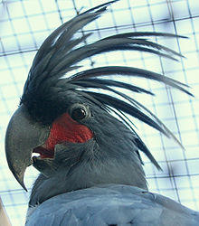 The palm cockatoo (Probosciger aterrimus), also known as the goliath cockatoo or great black cockatoo, is a large smoky-grey or black parrot of the cockatoo family native to New Guinea, Aru Islands, and Cape York Peninsula. It has a very large black beak and prominent red cheek patches.[2]