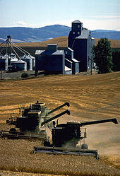 Early farming was extremely labor-intensive and relied heavily on human and horse-power. An organized harvesting/threshing team in the 1920s required 120 men and 320 mules and horses.[13] Teams moved from farm to farm as the crops ripened. By this point, the combine had been invented and was in use, but few farmers had enough horses to pull such a machine, which required a crew of 40 horses and six men to operate on level ground. Because of this, use of combines on the Palouse lagged behind use in other farming communities in the United States.