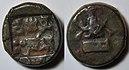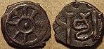 Numismatic evidence reveals the existence of independent rulers of Panchala during the post-Mauryan period. Most of the coins issued by them are found at Ahichatra and adjoining areas. All the coins are round, made of a copper alloy and have a set pattern on the obverse-a deeply incised square punch consisting of a row of three symbols and the ruler's name placed in a single line below them. The reverse bears depictions of the deities or sometimes of their attributes, whose names form a component of the issuers' names (for example, coins of Agnimitra bear the depiction of Agni). The names of the rulers found on these coins are Vangapala, Yajnapala, Damagupta, Rudragupta, Jayagupta, Suryamitra, Phalgunimitra, Bhanumitra, Bhumimitra, Dhruvamitra, Agnimitra, Indramitra, Vishnumitra, Jayamitra, Prajapatimitra, Varunamitra, Anamitra, Bhadraghosha and Yugasena (the reverse of the coins of Varunamitra, Yugasena and Anamitra do not exhibit any deity). Shaunakayaniputra Vangapala, ruler of Ahichatra, whom Vaidehiputra Ashadhasena mentioned as his grandfather in his Pabhosa inscription, is identified with king Vangapala, known from his coins. The name of Damagupta is also found on a clay sealing.[12][13]