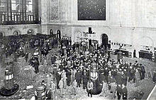 Because of past association with Charles W. Morse and F. Augustus Heinze, on Monday, October 21, the board of the Knickerbocker asked that Barney resign (depositors may have first begun to pull deposits from the Knickerbocker on October 18, prompting the concern).[25] That day, the National Bank of Commerce where J.P. Morgan was a dominant factor, announced it would not serve as clearing house for the Knickerbocker. On October 22, the Knickerbocker faced a classic bank run. From the bank's opening, the crowd grew. As The New York Times reported, "as fast as a depositor went out of the place ten people and more came asking for their money [and the police] were asked to send some men to keep order".[29] Two van loads of notes were quickly unloaded, yet even this failed to calm the panic stricken depositors. Directors and other officials of the Trust forced their way through the crowd, assuring them that everyone would be paid.[30] In less than three hours, $8 million was withdrawn from the Knickerbocker. Shortly after noon it was forced to suspend operations.[25]