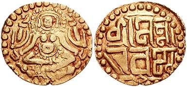 Coin of the Paramara king Naravarman, circa 1094-1133. Goddess Lakshmi seated facing / Devanagari legend.[19]