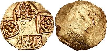 A Chaulukya-Paramara coin, circa 950-1050 CE. Stylized rendition of Chavda dynasty coins: Indo-Sassanian style bust right; pellets and ornaments around / Stylised fire altar; pellets around.[18]