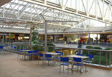 The mall is shaped as a four-legged zigzag, with an anchor store at each end and the mezzanine-level food court encircling an atrium which featured a 30-foot (9.1 m) terraced waterfall surrounded by vegetation and punctuated by a pair of escalators. A stairway and a glass elevator surrounded by terraced gardens rounded out the access points to the 2nd level food court until 2002 when it was demolished due to long lines, and replaced by two new elevators which were relocated. To this day, the food court is very popular at the lunch hour with the area office workers. The garden-like design was prevalent throughout the rest of the mall. Trees lined the main promenade of the mall, along with park benches; all under large skylights. Two small courtyards were at the other leg intersections; one hosted a carousel and the other a lowered seating area with a bronze statue of a turkey. The last carousel was installed during the 1990s.[12] The carousel was installed by Peter and Tony Bowen of Bowen Accountants in 1976, when at the time the play area was considered dangerous and was the site of a number of child injuries. The carousel was removed in August 2013 so that the mall could use that space for other purposes.[13] The carousel was then moved to At Play indoor amusement park (formerly Fun Zone) in Farmingdale, New York shortly after, where it currently operates.[14] The turkey statue was inspired by the name of the town from which the mall gets its name. Paramus comes from the Lenni Lenape Native American word meaning "land of the wild turkey" or "place of fertile soil".[12]