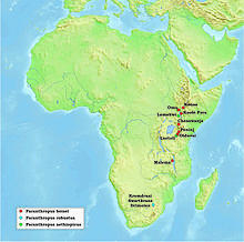 P. aethiopicus is the earliest member of the genus, with the oldest remains, from the Ethiopian Omo Kibish Formation, dated to 2.6 mya at the end of the Pliocene. It is sometimes regarded as the direct ancestor of P. boisei and P. robustus.[10] It is possible that P. aethiopicus evolved even earlier, up to 3.3 mya, on the expansive Kenyan floodplains of the time.[26] The oldest P. boisei remains date to about 2.3 mya from Malema, Malawi.[10] P. boisei changed remarkably little over its nearly 1 million year existence.[27] Paranthropus had spread into South Africa by 2 mya with the earliest P. robustus remains.[28][29][16]