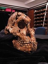 The genus Paranthropus was first erected by Scottish South African palaeontologist Robert Broom in 1938, with the type species P. robustus.[1] "Paranthropus" derives from Ancient Greek παρα para beside or alongside; and άνθρωπος ánthropos man.[2] The type specimen, a male braincase, TM 1517, was discovered by schoolboy Gert Terblanche at the Kromdraai fossil site, about 70 km (43 mi) southwest of Pretoria, South Africa.[1] By 1988, at least 6 individuals were unearthed in around the same area, now known as the Cradle of Humankind.[3]