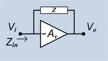 The diagram, right, illustrates how Miller capacitance comes about. Suppose the amplifier shown is an ideal inverting amplifier with voltage gain of A, and Z = C is a capacitance between its input and output. The output voltage of the amplifier is