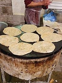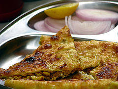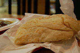 A paratha (pronounced [pəˈrɑːtʰə]) is a flatbread native to the Indian subcontinent,[1] prevalent throughout the modern-day nations of India, Sri Lanka, Pakistan, Nepal, Bangladesh, Maldives and Myanmar,[2] where wheat is the traditional staple. Paratha is an amalgamation of the words parat and atta, which literally means layers of cooked dough.[3] Alternative spellings and names include parantha, parauntha, prontha, parontay, paronthi (Punjabi), porota (in Odia, Bengali, Malayalam), palata (pronounced [pəlàtà]; in Burma),[2] porotha (in Assamese), forota (in Sylheti) and farata (in Mauritius and the Maldives).