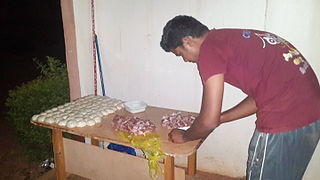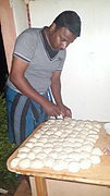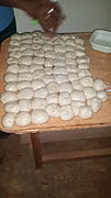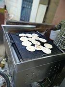 Porottas (Parathas) are often available as street food[1] and in restaurants across Punjab,Kerala, Tamil Nadu, Karnataka, Andhra Pradesh and Telangana. At some places it is also served at weddings, religious festivals and feasts. It is prepared by kneading maida/wheat flour, egg (in some recipes), oil or ghee and water. The dough is beaten into thin layers and later forming a round spiralled into a ball using these thin layers. The ball is rolled flat and pan fried.[2][3]