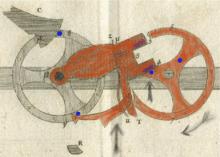 On all the wheels of all the known machines, except for the machine tardive,[8] two adjacent spokes are marked; these marks differ from machine to machine. On the wheel pictured on the right, they are drilled dots, on the surveying machine they are carved; some are just scratches or marks made with a bit of varnish,[9] some were even marked with little pieces of paper.[10]