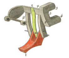 The sautoir is the centerpiece of the pascaline's carry mechanism. In his "Avis nécessaire...", Pascal noted that a machine with 10,000 wheels would work as well as a machine with two wheels because each wheel is independent of the other. When it is time to propagate a carry, the sautoir, under the sole influence of gravity,[15] is thrown toward the next wheel without any contact between the wheels. During its free fall the sautoir behaves like an acrobat jumping from one trapeze to the next without the trapezes touching each other ("sautoir" comes from the French verb sauter, which means to jump). All the wheels (including gears and sautoir) have therefore the same size and weight independently of the capacity of the machine.