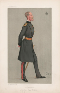Educated at Eton College, Methuen served two years as a cornet in the Royal Wiltshire Yeomanry and then joined the Scots Fusilier Guards as an ensign in the regiment and lieutenant in the army on 22 November 1864.[2] He was promoted to lieutenant in the regiment and captain in the army on 25 December 1867,[3] and became adjutant of the 1st battalion in 1868.[4] He became brigade major, Home District in 1871 and saw active duty on the staff of Sir Garnet Wolseley at Amoaful in 1873 during the Third Anglo-Ashanti War.[4] Promoted to captain in the regiment and lieutenant colonel in the army on 15 July 1876,[5] he became assistant military secretary in Ireland in 1877, military attaché in Berlin in 1878 and quartermaster-general at the Home District in April 1881,[6] before being promoted to colonel on 1 July.[7] He was the commandant of headquarters in Egypt for three months in 1882,[8] being present at the Battle of Tel el-Kebir.[4] On return to the UK he became assistant-adjutant and quartermaster-general for the Home District again.[9] He was promoted to major in the regiment on 25 October 1882.[10]