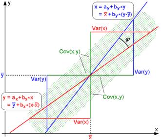 For uncentered data, there is a relation between the correlation coefficient and the angle φ between the two regression lines, y = gX(x) and x = gY(y), obtained by regressing y on x and x on y respectively. (Here, φ is measured counterclockwise within the first quadrant formed around the lines' intersection point if r > 0, or counterclockwise from the fourth to the second quadrant if r < 0.) One can show[16] that if the standard deviations are equal, then r = sec φ − tan φ, where sec and tan are trigonometric functions.