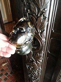 Huston designed the large bronze doors at the capitol's main entrance. They were modeled by sculptor Otto Jahnsen and were both cast in one piece using the lost wax method of casting by the Henry Bonnard Bronze Company.[60] The doors are decorated with scenes from the history of Pennsylvania, such as the arrival of William Penn and his peace treaty with the Lenape. Busts of people who were important in the construction of the capitol, like Governor Pennypacker, Boies Penrose, and Matthew Quay, decorate the edges of the doors.[61] The bust of Huston hides the doors' keyhole.