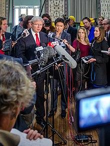 In December 2007, in the wake of the Labor Party victory in the 2007 election, Wong was appointed to the Cabinet of Australia in the First Rudd Government as the Minister for Climate Change and Water[29] and later, for Climate Change, Energy Efficiency and Water in early 2010.[30] She later remarked that her own father was most proud, not so much at her becoming the first Asian-born person to serve in an Australian Cabinet, but because she was subsequently given "a fleeting mention"[31] in a book by Lee Kuan Yew. She accompanied then Prime Minister Kevin Rudd to Bali for the international climate change talks. Wong led final negotiations as Chair of the United Nations Working Group in the closing days of the United Nations Climate Change Conference in December 2007,[32] shortly after her appointment as minister. She was said to be one of the "Rudd gang of four", who made "the key decisions."[33]