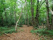 The eponymous wood itself survives and is managed by the National Trust. Originally just 88 acres (36 hectares) were bought by public subscription and donated to the Trust in 1927, after it became clear that the area would be developed for housing.[3] This asset expanded when the neighbouring Hawkwood Estate and Edlmann Wood, comprising a further 250 acres (100 hectares), were donated to the Trust by landowners Robert and Francesca Hall in 1957. The woodland features oak, birch, rowan, alder, ash, hornbeam and sweet chestnut.
