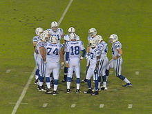 Manning and the Colts introduced the no-huddle offense, and used it to great effect in a Week 1 rout of the New York Jets, 45–24.[128] Two weeks later (Week 2 games were not played as scheduled due to the 9/11 attacks), the Colts advanced to 2–0 with a win over Buffalo, behind Manning's 421 yards passing.[129] He was named AFC Offensive Player of the Week for this game.[87] However, the Colts lost the following week in a 38–17 loss to the New England Patriots, which was the first meeting between Manning and Tom Brady.[130] The Colts continued their slide, losing their following two games.[131] The Colts briefly rebounded, winning two games, but then lost seven of their last nine games. In the stretch, Manning a threw a career-high 86-yard touchdown pass to Marcus Pollard in the 34–20 loss to the New Orleans Saints.[132] After a 40–21 home loss to the 49ers,[133] in which Manning threw a career-high four interceptions in that game, coach Jim Mora uttered his famous "Playoffs? Don't talk about playoffs," at the press conference.[134]