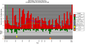 As a slow left-arm orthodox spin bowler, Tufnell played 42 Test matches and 20 One Day Internationals for England between 1990 and 2001, and 316 first-class matches, mainly for Middlesex. Tufnell was occasionally inspired with the ball, taking 11–93 against Australia at the Oval in 1997 (for which he won the Man of the Match award after England won by 19 runs) and seven wickets in the match (6-25 in the first innings) against the West Indies at the Oval in 1991,[5] but he took his 121 Test wickets with a bowling average of 37.68 across his whole Test career. Mark Waugh theorised that "if you attack him, he can go on the defensive, and it puts him off his game",[6] although Waugh was Tufnell's most frequent test victim, being dismissed a total of seven times by him, three of them bowled.[7]