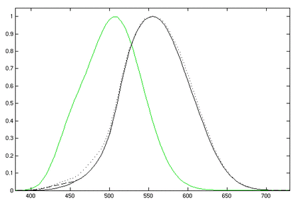 The human eye is not equally sensitive to all wavelengths of visible light. Photometry attempts to account for this by weighing the measured power at each wavelength with a factor that represents how sensitive the eye is at that wavelength. The standardized model of the eye's response to light as a function of wavelength is given by the luminosity function. The eye has different responses as a function of wavelength when it is adapted to light conditions (photopic vision) and dark conditions (scotopic vision). Photometry is typically based on the eye's photopic response, and so photometric measurements may not accurately indicate the perceived brightness of sources in dim lighting conditions where colors are not discernible, such as under just moonlight or starlight.[1] Photopic vision is characteristic of the eye's response at luminance levels over three candela per square metre. Scotopic vision occurs below 2 × 10−5 cd/m2. Mesopic vision occurs between these limits and is not well characterised for spectral response.[1]