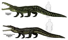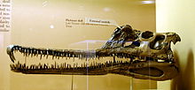 Inversely, some dolichorostral forms like Mystriosuchus have become further specialised to life in the water, and occurred in marine environments.[11] A skeleton of Mystriosuchus planirostris, found in a marine setting and with evidence of little post-mortem transportation – indicating that it died either at sea or in a freshwater environment nearby – shows that this animal had paddle-like limbs, less adapted for terrestrial locomotion than in most other phytosaurs.[12] Furthermore, the tail of Mystriosuchus was laterally compressed and could have been used in propulsion.[13]
