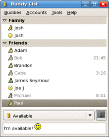 The program was originally written by Mark Spencer, an Auburn University sophomore, as an emulation of AOL's IM program AOL Instant Messenger on Linux using the GTK+ toolkit.[5] The earliest archived release was on December 31, 1998.[6] It was named GAIM (GTK+ AOL Instant Messenger) accordingly. The emulation was not based on reverse engineering, but instead relied on information about the protocol that AOL had published on the web. Development was assisted by some of AOL's technical staff.[5][7] Support for other IM protocols was added soon thereafter.[5]