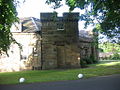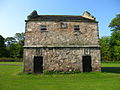 Doocot (English 'Dovecote') at Pinkie House with Seton's characteristic cipher of a crowned crescent and cinquefoil over door to right