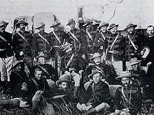 Rhodes's military advisers estimated that it would take 2,500 men and about one million pounds to win the war that would, they thought, inevitably result when Lobengula realised that Rhodes meant not only to mine but also to occupy his land. Frank Johnson, a 23-year-old adventurer, however, undertook to deliver the territory in nine months with a mere 250 men for £87,500. Frederick Selous, a hunter with close knowledge of Mashonaland, agreed to join the effort as guide. Johnson published recruitment notices in Kimberley offering each volunteer 1,200 hectares (3,000 acres) of land and 15 mining claims (aggregating about 8.5 hectares (21 acres)). On the advice of Rhodes, Johnson selected for his column, from thousands of applicants, mostly the sons of rich families, so that if they were, indeed, imperiled by Lobengula their families would be more likely to enlist British government support for their rescue. Johnson's column eventually consisted of 180 civilian colonists, 62 wagons and 200 volunteers (who ultimately formed the nucleus of what became the British South Africa Police). A further party of 110 men, 16 wagons, 250 cattle and 130 spare horses later attached itself to the column.[2] The troopers were equipped with Martini-Henry rifles, revolvers, seven-pound field guns and Maxim machine guns, as well as an electric searchlight (which they later used to good effect to intimidate Matabele warriors shadowing the column).