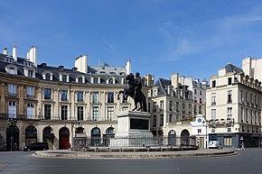 The Place des Victoires is a circular place[1] in Paris, located a short distance northeast from the Palais Royal and straddling the border between the 1st and the 2nd arrondissements. The Place des Victoires is at the confluence of six streets: Rue de la Feuillade, Rue Vide Gousset, Rue d'Aboukir, Rue Étienne Marcel, Rue Croix-des-Petits-Champs, and Rue Catinat.