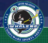 The Plymouth Whaler logo features an angry hockey stick-wielding whale, blowing a puck and spout of water out its blow hole. The name Whalers is superimposed on the image surround by a circle of green and blue with waves in the background.