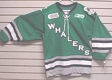 The Whalers blue Jersey has the whaler logo in the center with a white space and green space going down the sleeves