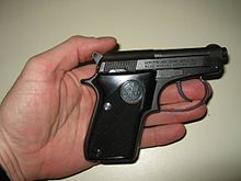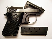 The Beretta 950s are 9-shot, .25 ACP (Jetfire) or .22 Short (Minx) semi-automatic pistols introduced by Beretta in 1952. They build on a long line of small and compact pocket pistols manufactured by Beretta. They are very simple and reliable blowback operated pistols with a single action trigger mechanism.[14] Their frames are made out of aluminum alloy, their slides and barrels are carbon steel.[15] They feature a unique tip-up barrel for ease of loading. Early models (*950* and *950B* Pre-1968) do not have a safety lever, employing a half-cock notch on the hammer instead. Later models (*950BS* Post-1968) are provided with an manual safety lever.[15][16] In 1984 Beretta would introduce a double-action version the Beretta 21A Bobcat. And, in 1996 they introduced the larger .32 ACP Beretta 3032 Tomcat.