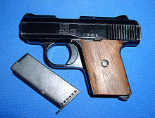 The Walther PP (Polizeipistole, or police pistol) series pistols were introduced in 1929 and are among the world's first successful double action, blowback-operated semi-automatic pistols, developed by the German arms manufacturer Carl Walther GmbH Sportwaffen.[8][9] They feature exposed hammers, a traditional double-action trigger mechanism,[10] and a fixed barrel that also acts as the guide rod for the recoil spring. It was offered in both .32 ACP (9-shot) and .380 ACP (8-shot) calibers. The Walther PP and smaller PPK models were both popular with European police and civilians for being reliable and concealable. They would remain the standard issue police pistol for much of Europe well into the 1970s and 80s. During World War II, they were issued to the German military, including the Luftwaffe.[9]