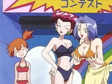 In this episode, the female characters all enter a beauty contest. Team Rocket also enters, with James donning a suit with inflatable breasts. One scene of the episode involved James showing off his artificial breasts for humorous effect, taunting Misty by saying: "Maybe, one day when you're older, you'll have a chest like this!" In one scene, he puffs up his breasts to over twice their original size. When it was dubbed and aired in 2000, all scenes of James in a bikini (about 40 seconds) were edited. There were a number of other sexualized scenes, such as one in which Ash and Brock are stunned at the sight of Misty in a bikini and another in which an older man appears to be attracted to her. In addition, all Japanese text on signs, etc. remains intact in this episode, as opposed to other first-season episodes in which it was digitally replaced with English text.