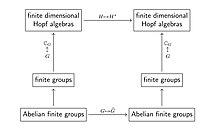 The theories of first type appeared later and the key example for them was the duality theory for finite groups.[21][22] In this theory the category of finite groups is embedded by the operation of taking group algebra (over ) into the category of finite dimensional Hopf algebras, so that the Pontryagin duality functor turns into the operation of taking the dual vector space (which is a duality functor in the category of finite dimensional Hopf algebras).[22]