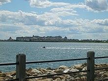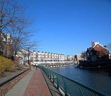 Commenced in the 1980s, this European-style mixed-use complex planned for 2,280 residential units, a 245-boat slip marina, 590 canal boat slips, 350-room hotel, a 46,000-square-foot (4,300 m2) office building, retail/commercial spaces recreation facilities, a health club and a yacht club. However, the complexity of the design, the costly canal engineering and the collapse of Wall Street in the late 1980s drove the project to bankruptcy. Only 37 town homes and 363 of the planned residential units are completed. Joseph Barry of the Applied Company based at Hoboken, New Jersey took it over, abandoned the canal plan and completed Phase 1 and Phase 2 of construction in early 2000s.[6]