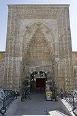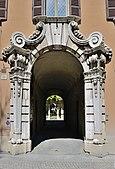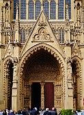 A portal is an opening in a wall of a building, gate or fortification, especially a grand entrance to an important structure.[1] Doors, metal gates, or portcullis in the opening can be used to control entry or exit. The surface surrounding the opening may be made of simple building materials or decorated with ornamentation. The elements of a portal can include the voussoir, tympanum, an ornamented mullion or trumeau between doors, and columns with carvings of saints in the westwork of a church.