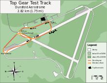 The track is on a former Royal Canadian Air Force airbase constructed during the Second World War and later used by British Aerospace (and its predecessors) as a manufacturing and test facility.[3] The track's main route, marked by painted lines and simple structures such as stacks of tyres, was designed by test drivers from Lotus.[4][5] The layout of the track is designed to put the car through various conditions, ranging from provoking understeer to testing brake balance and tyres. The track is approximately 1.75 miles (2.82 km) long. It is considered to be an equaliser for cars since, according to Richard Hammond, both 0–60 miles per hour (0–96.6 km/h) times and top speed are totally meaningless.[4] The track also incorporates a drag strip; although this is not used for timed segments, it does feature in some challenges and other features on the show.