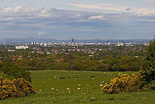 Poynton is located at SJ925835 53°20′53″N 2°06′50″W / 53.348°N 2.114°W, between the Norbury Brook and the Poynton Brook at the easternmost limit of the Cheshire Plain. The land is between 88 metres (289 ft) and 190 metres (620 ft) above sea level. The town is approximately 17 kilometres (11 mi) SSE of Manchester, 8 kilometres (5.0 mi) from Manchester Airport, 15 kilometres (9.3 mi) from junction 5 of the M56 motorway and 10 kilometres (6.2 mi) from junction 3 of the M60 motorway. The west of the parish is predominantly residential, buffered from Hazel Grove and Bramhall by the North Cheshire Green Belt. To the south of the town are two business parks but here and to the east it is rural in nature, bounding on the former deer park of Lyme Hall.[15] The A6 trunk road passes to the north of the parish, and the Macclesfield Canal runs north/south along the 155 metres (509 ft) contour to the east of the parish.
